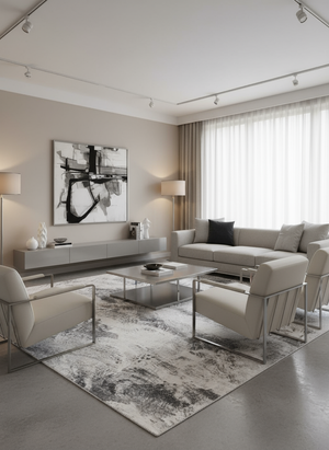 The Frost Veil Rug captures the essence of a misty winter morning with swirling silver-grey patterns on a white base. Crafted from ultra-soft faux rabbit fur, it combines modern sophistication with cozy warmth.