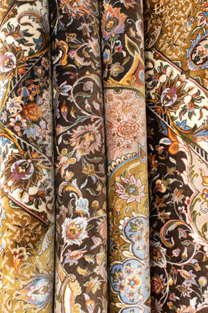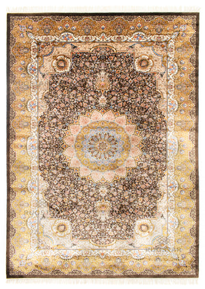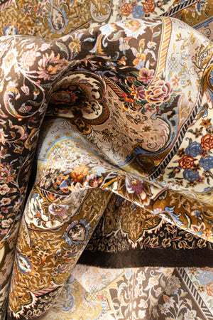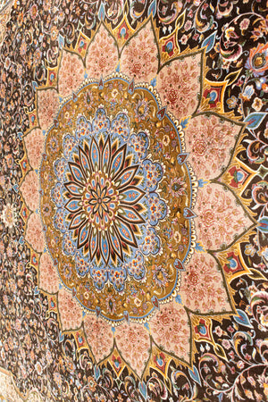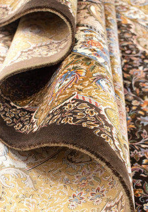 This Silk Bamboo Persian carpet radiates depth and sophistication with its rich mocha base and a striking lotus medallion centrepiece. Intricate gold detailing and refined ivory borders embody traditional Persian grace blended with modern grandeur - perfect for refined interiors.