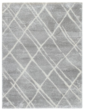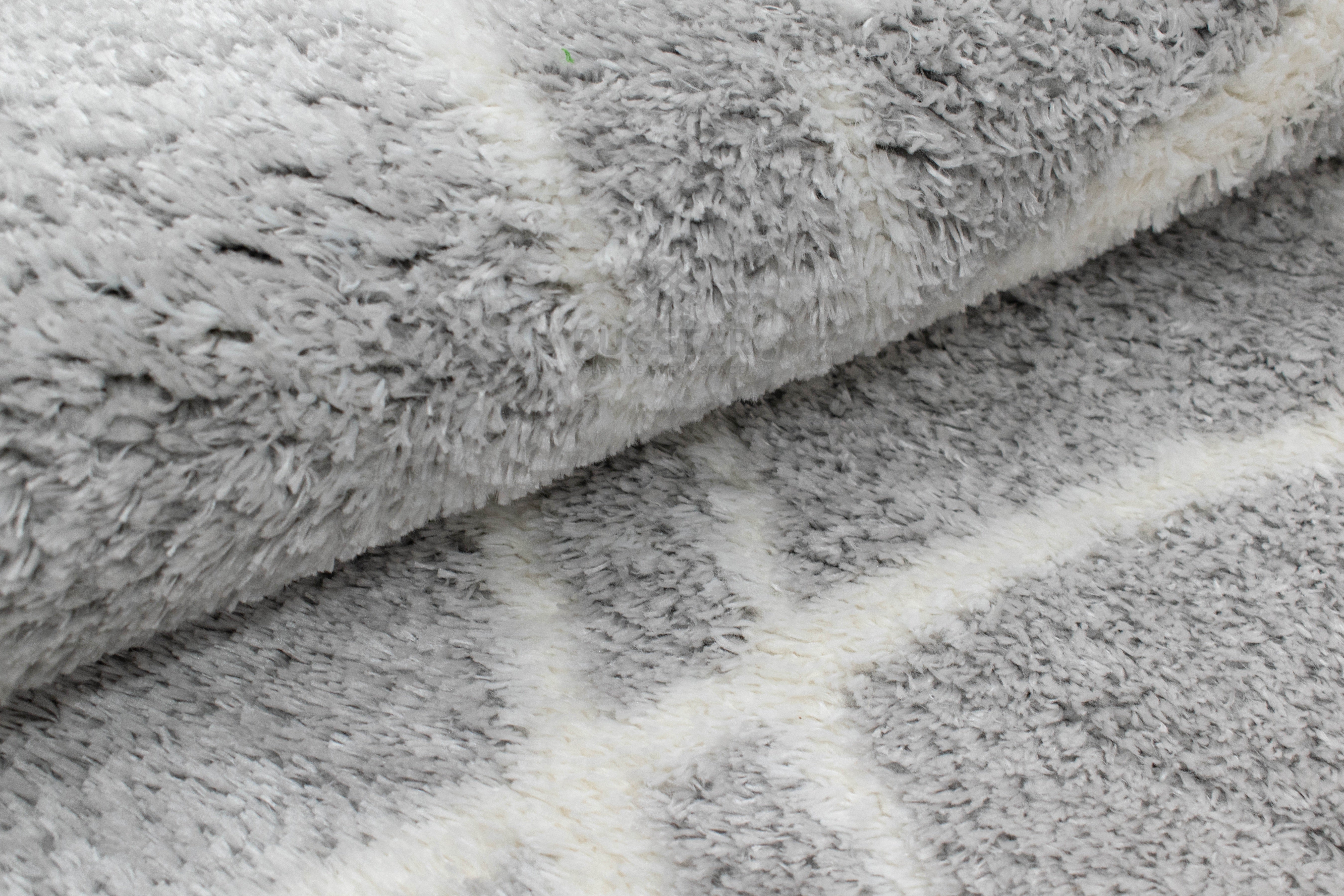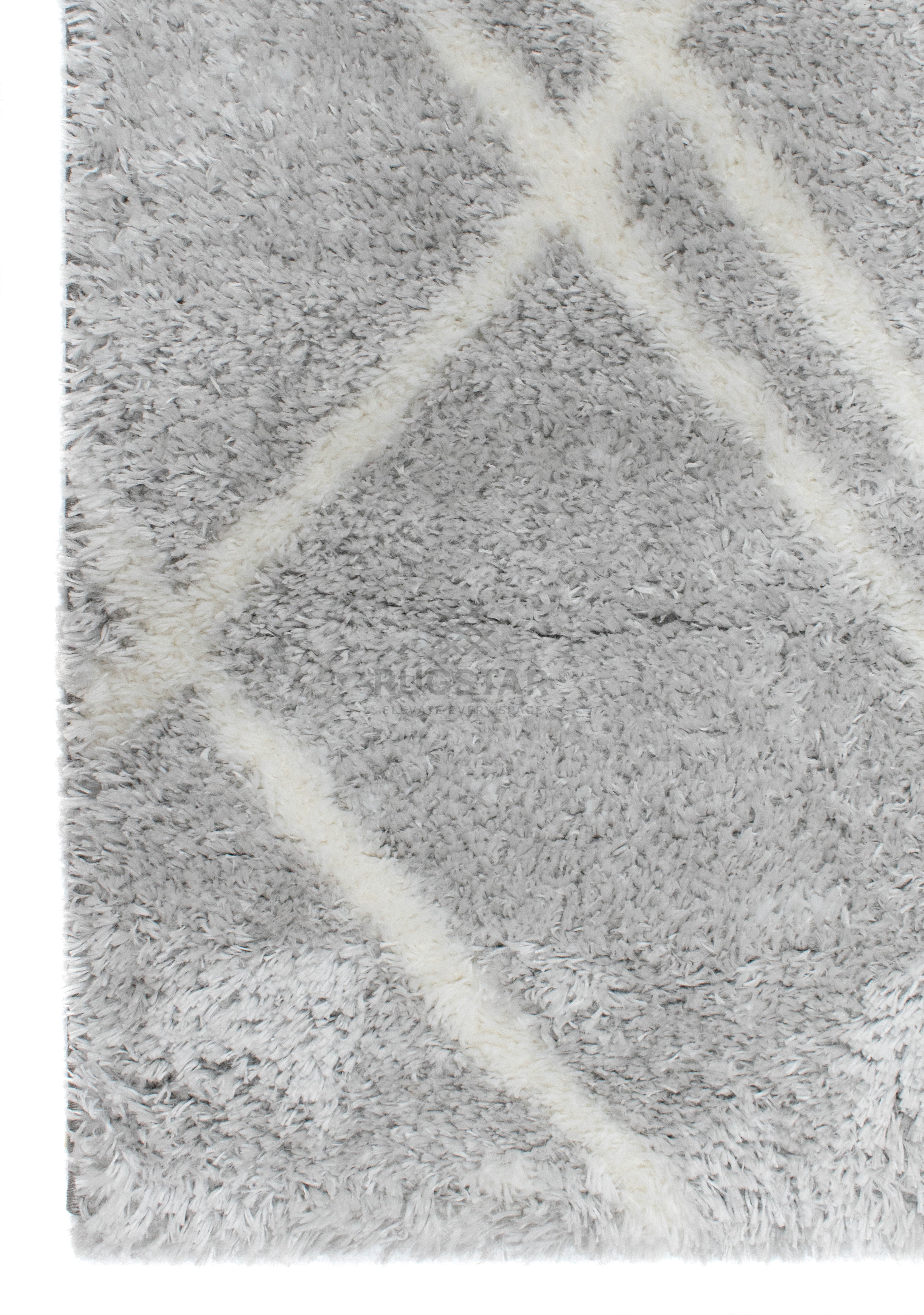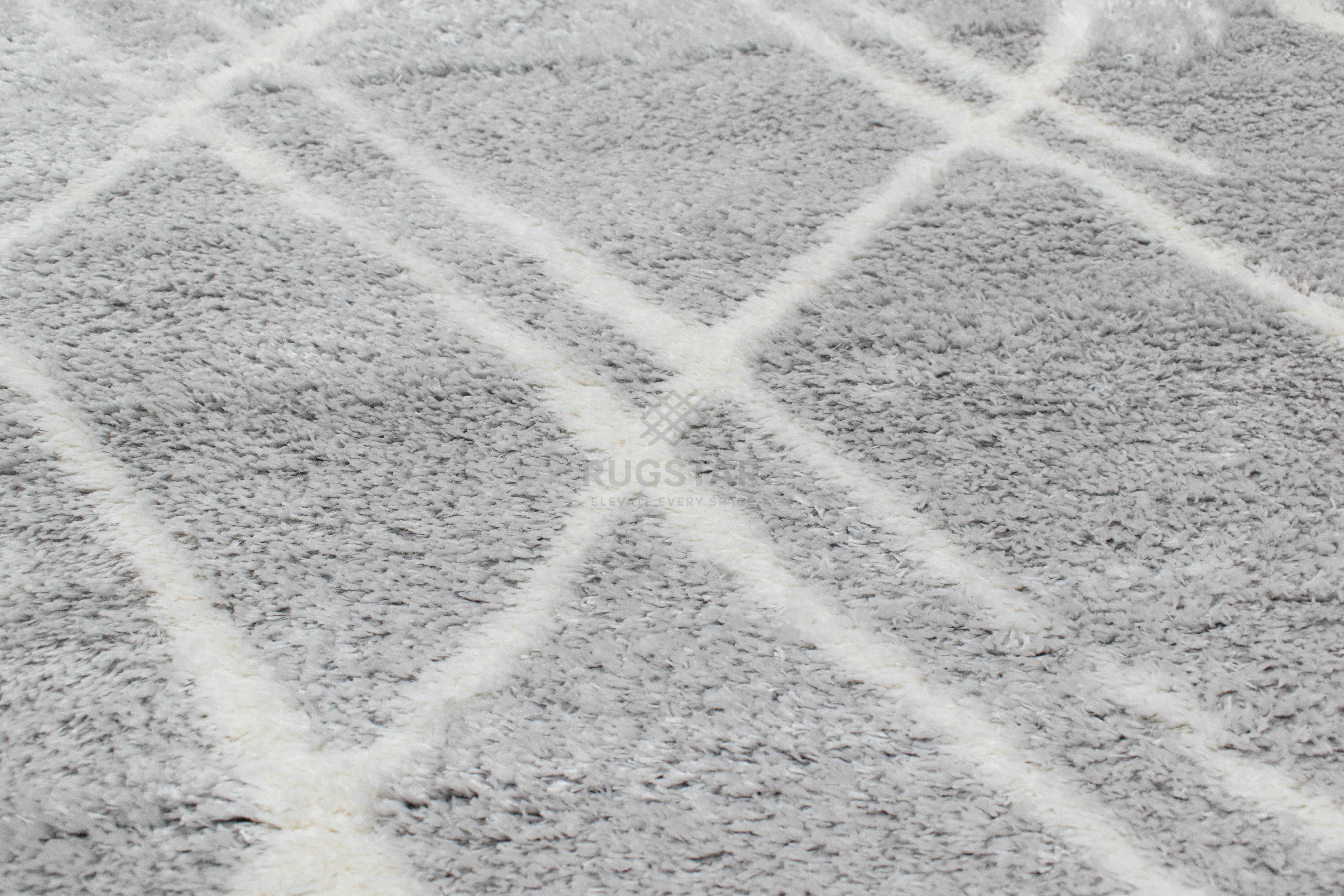 A sophisticated light-grey shaggy carpet with soft white diamond-line details. Plush, durable and perfect for calm, stylish interiors.