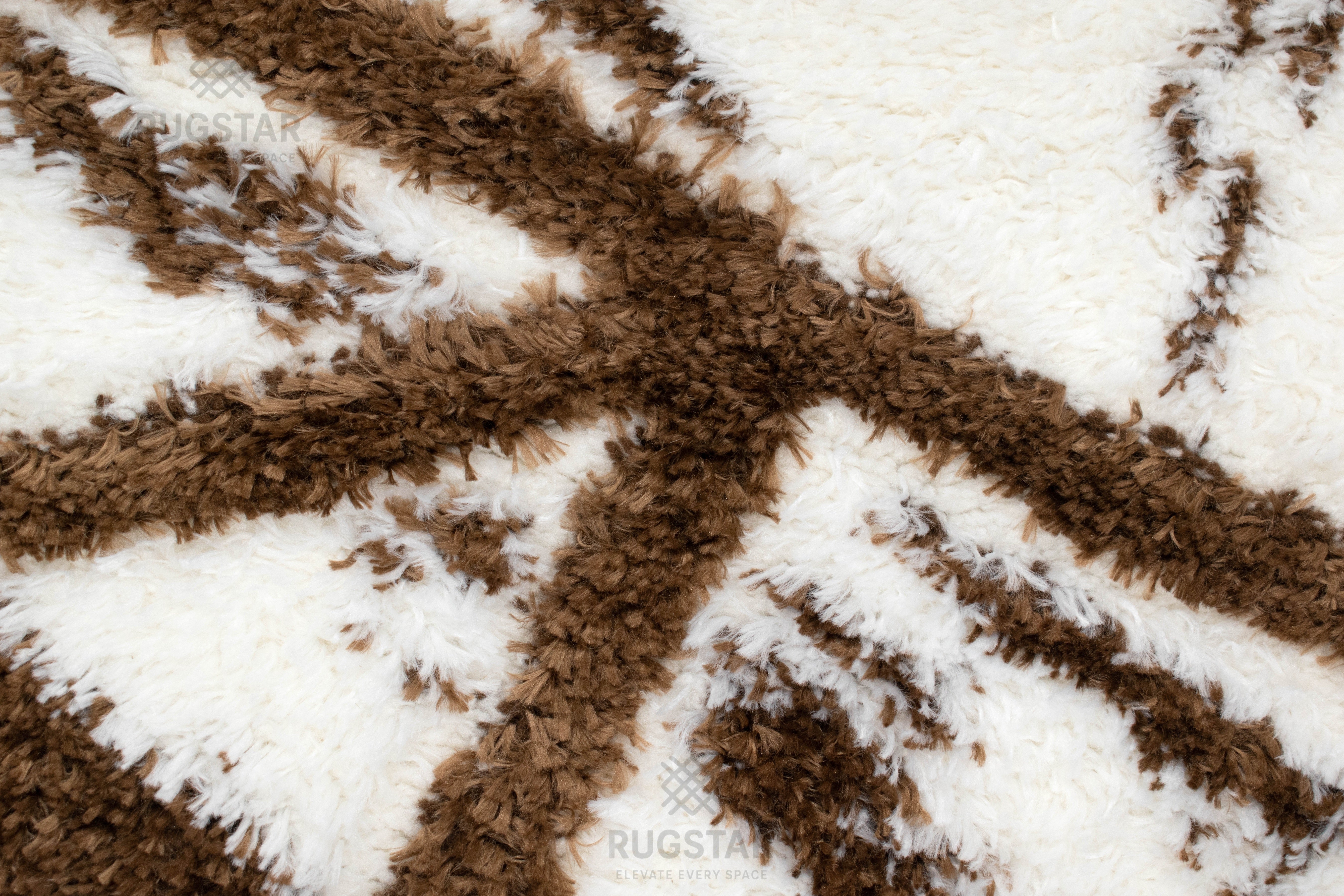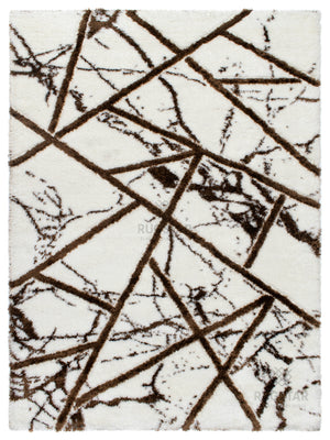 A modern white shaggy carpet enhanced with bold brown geometric abstract lines. Luxurious, soft and perfect for contemporary d?©cor.
