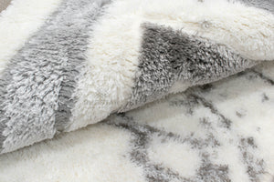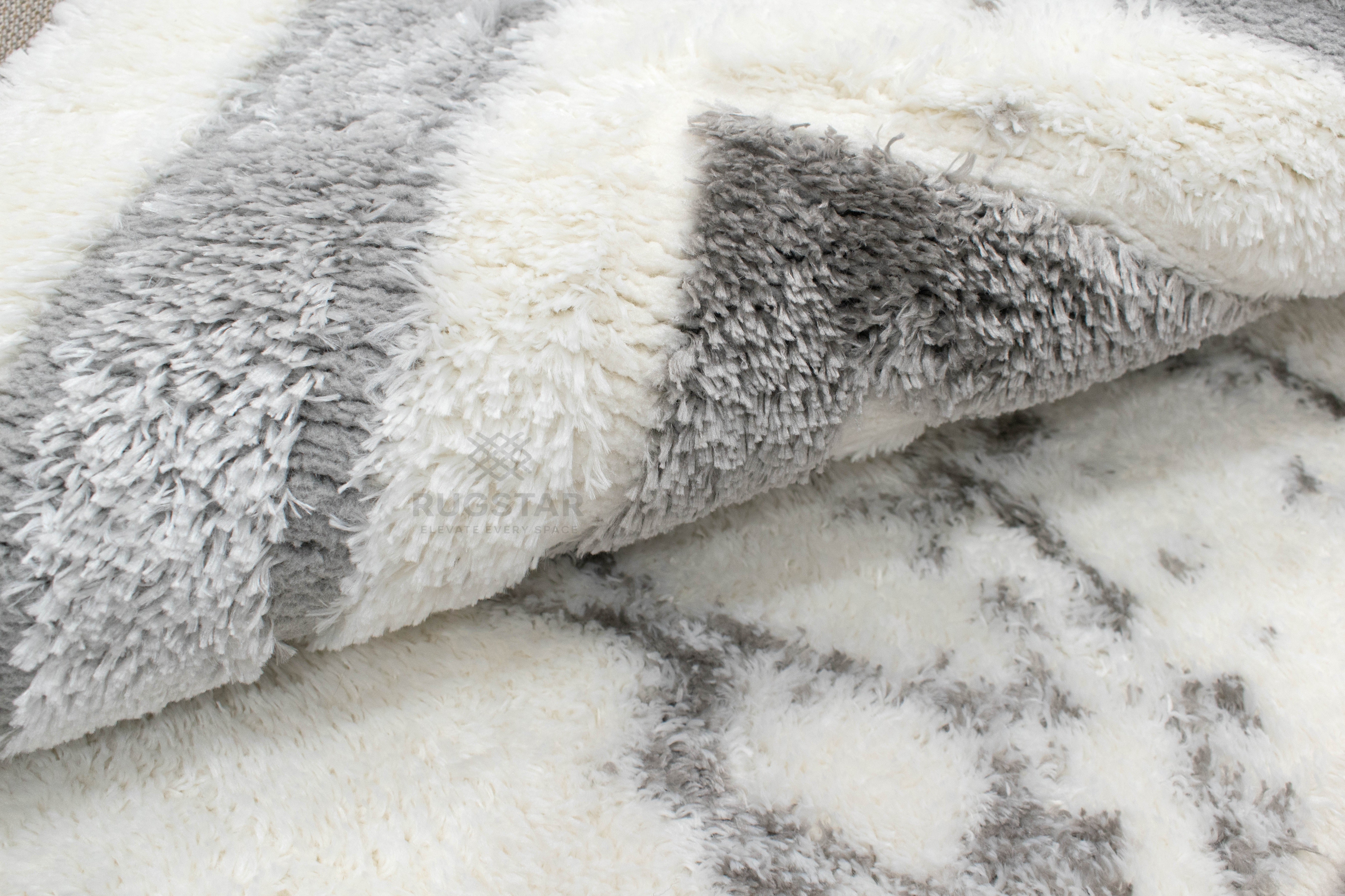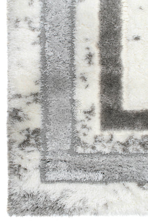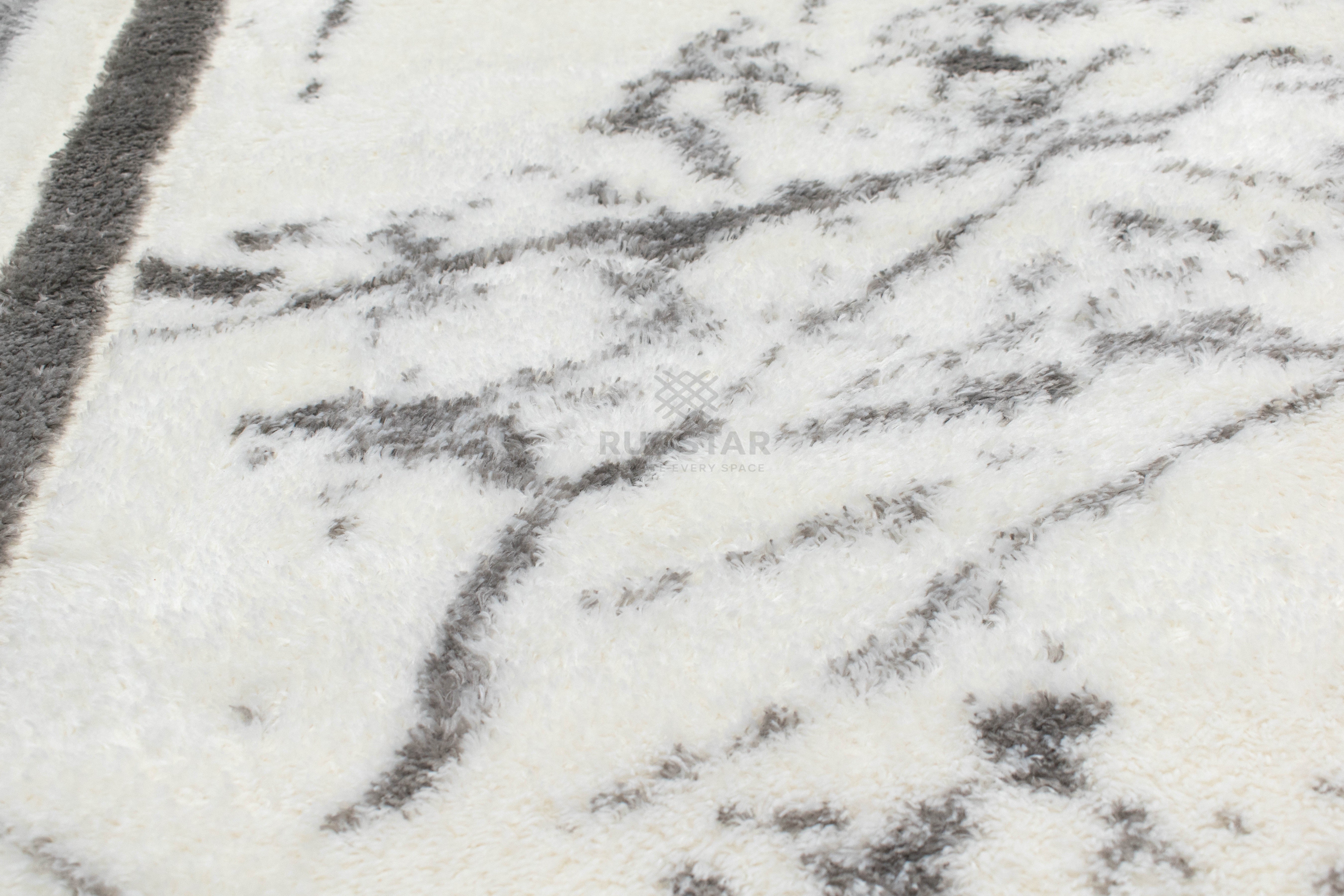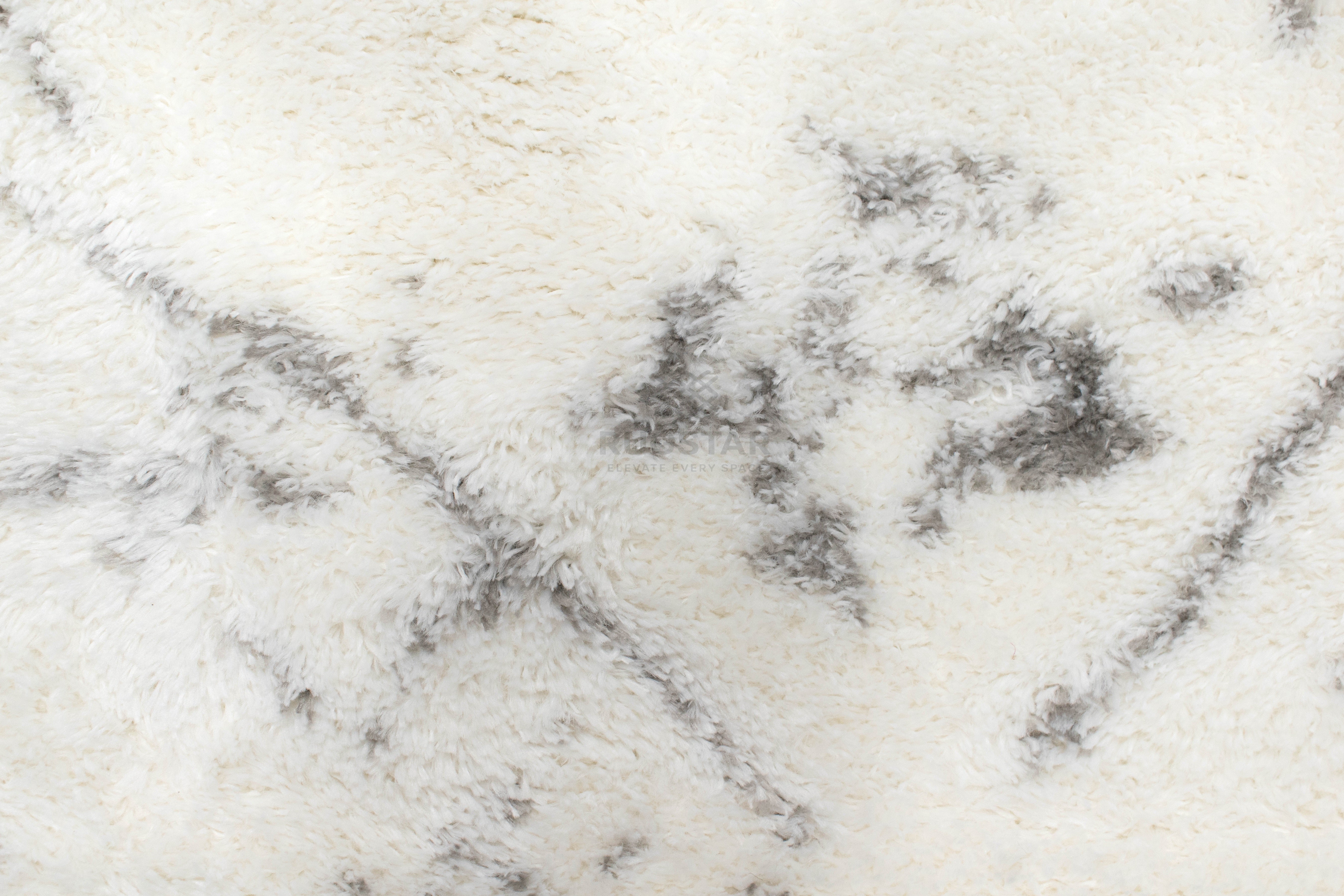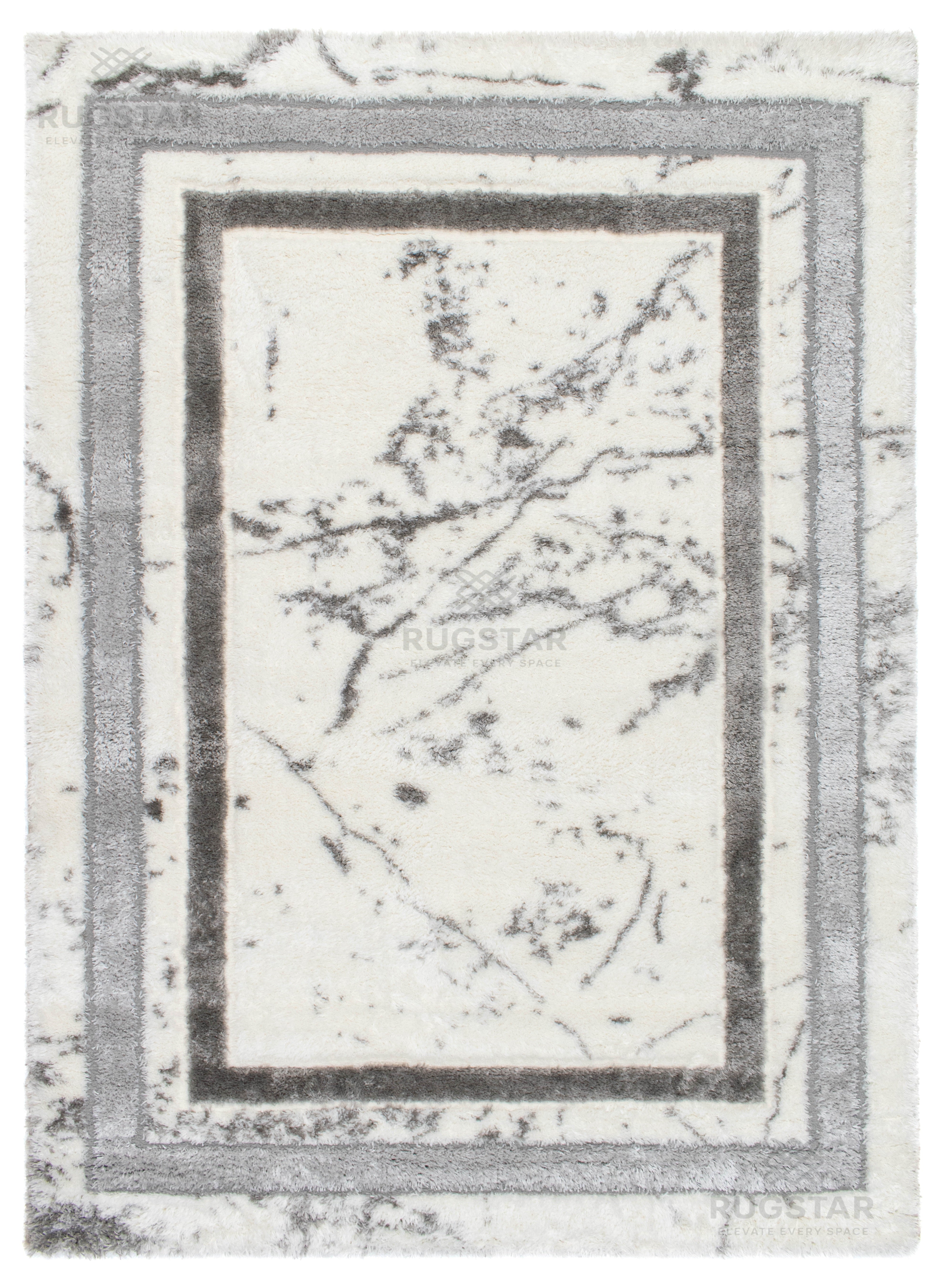 A luxurious white shaggy carpet accented with soft grey double borders and marble-style detailing. Perfect for modern, elegant and minimal interiors.